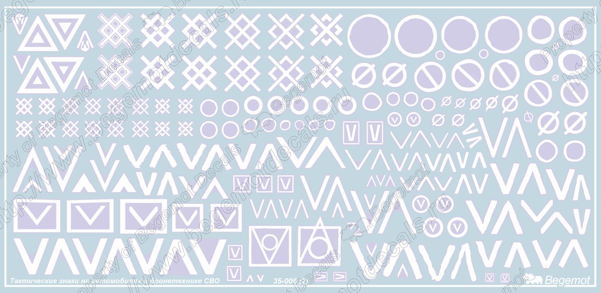 Тактические знаки на автомобилях и бронетехнике СВОДеколь с набором универсальных тактических знаков СВО на атомобильной и бронетехнике (Z, V, O и аналогичные). Набор не претендует на точную привязку к конкретным образцам и является скорее усредненным и универсальным набором знаков. Пожалуйста, ориентируйтесь на фото техники и подбирайте похожие знаки самостоятельно. Деколь сделана в сотрудничестве Begemot с SG Modelling, за что спасибо щедрым ребятам из Нижнего Тагила. В комплект входит два листа деколи большого размера, деколь без инструкции. Статус: Декаль доступна у дилеров. Загрузить инструкцию - [] Картинки Основная 1 2 ![]() | ||||||||||||||||||
