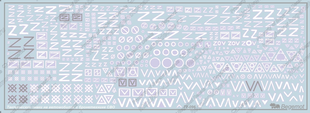 Тактические знаки на автомобилях и бронетехнике СВОДеколь с набором универсальных тактических знаков СВО на атомобильной и бронетехнике (Z, V, O и аналогичные). Набор не претендует на точную привязку к конкретным образцам и является скорее усредненным и универсальным набором знаков. Пожалуйста, ориентируйтесь на фото техники и подбирайте похожие знаки самостоятельно. Деколь сделана в сотрудничестве Begemot с SG Modelling, за что спасибо щедрым ребятам из Нижнего Тагила. В комплект входит один лист деколи стандартного размера, деколь без инструкции. Статус: Декаль доступна у дилеров. Картинки Основная 1 ![]() | ||||||||||||||||||