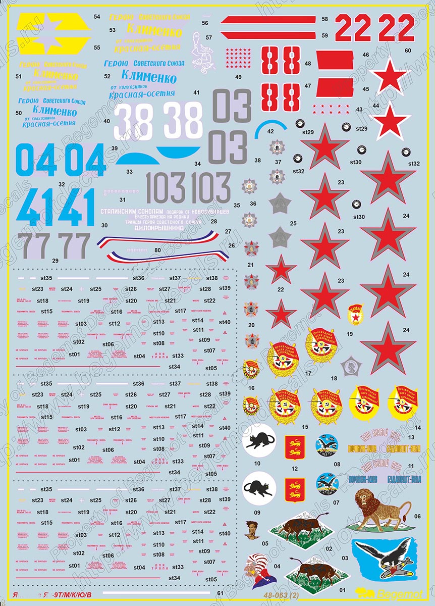 Y___v Y_k-9TDecal with opportunity make 84 marking variations of Y_k-9T (Y_k-9Т, Y_k-9M, Y_k-9K, Y_k-9U, Y_k-9V) family aircraft's all types, from the VVVS RKKA, including Normandy-Neman regiment. Including two big size decals and 13-pages instruction A3-size instruction. Status: Decal is accessible, asking our dealers. Download instruction sheet - [72-089 Y_k-9T ins 1.pdf] [72-089 Y_k-9T ins 2.pdf] Pictures Main 1 2 ![]() | ||||||||||||||||||
